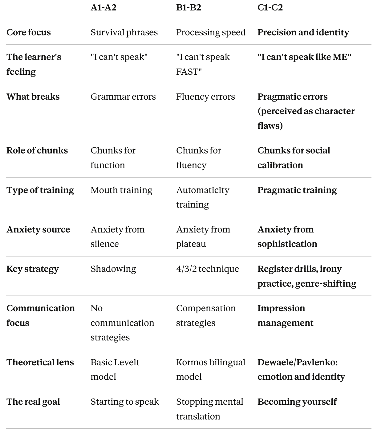 Before we look at what goes wrong at C1-C2, it helps to understand how speaking challenges transform as proficiency grows.